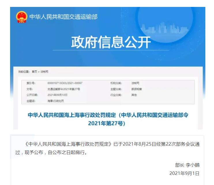 交通運輸部發(fā)布《中華人民共和國海上海事行政處罰規(guī)定》